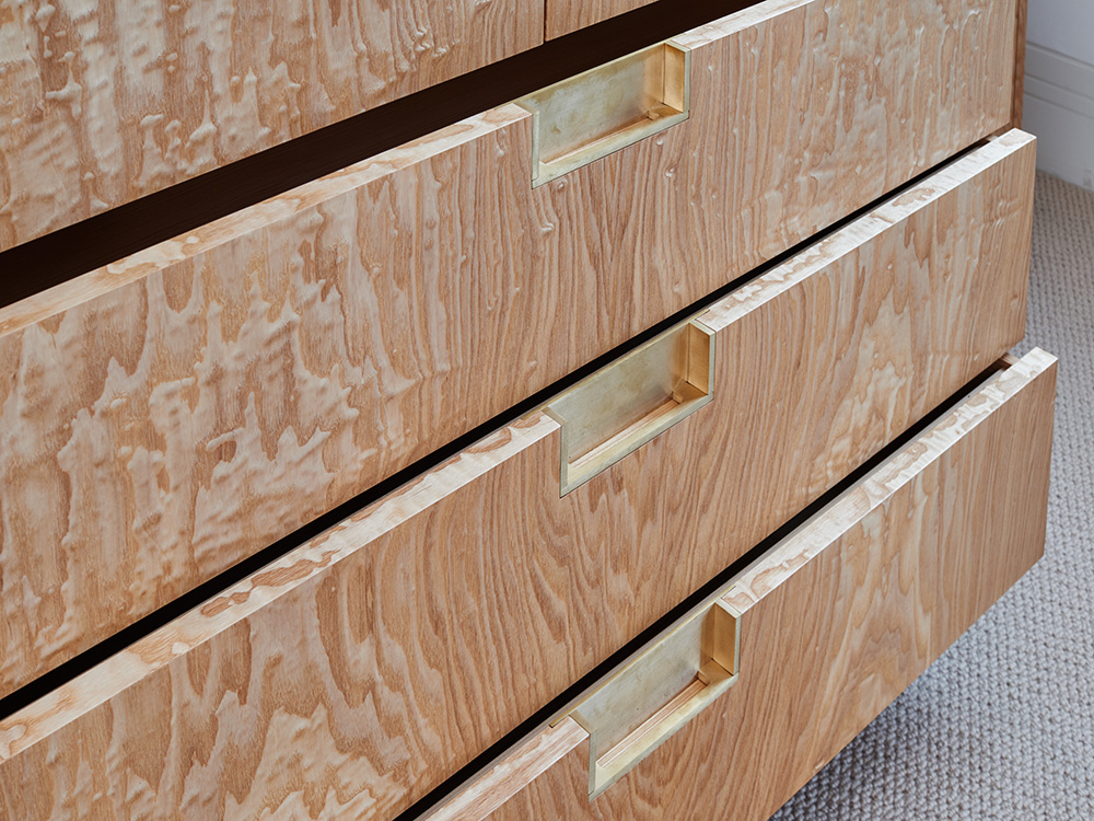 Large scale pieces of furniture need room to breathe and express themselves. I believe in freestanding wardrobes so they are not a blank, fitted face. This wardrobe is based on the shape of a classical breakfront bookcase but in the minimal style with flush metal details such as handles, feet and hinges. The legs continue into the side panels giving a very clean, minimal look. The flat faces allow for a highly patterned veneer finish. The wild grain of the Tamo wood contrasts with the minimal design and construction. The interior is constructed from cedar wood which has natural properties to discourage moths.