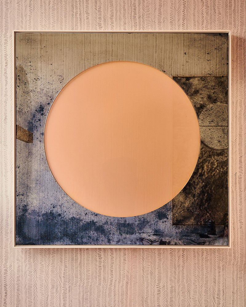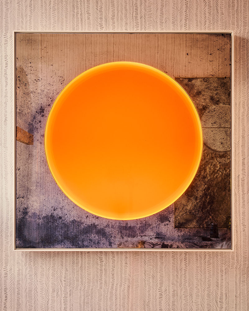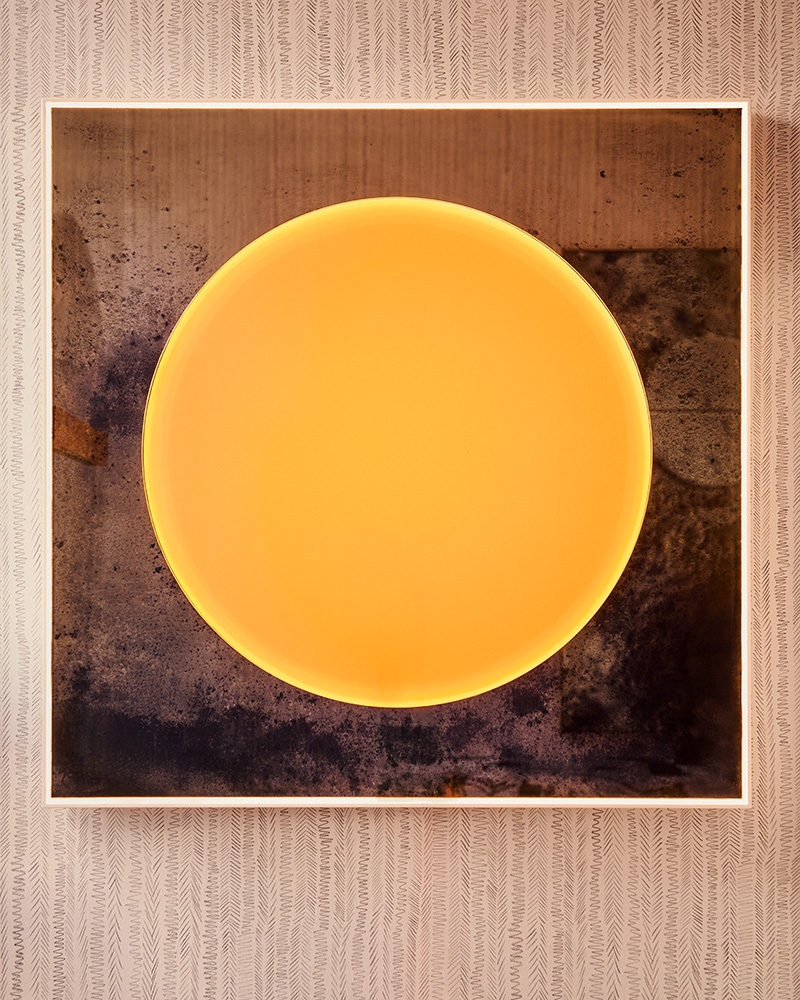 Kiln formed solid disc of clear glass atop hand silvered square mirror. Gloss lacquer shadow frame with integrated lighting. The clear glass is layered with coloured gels and backlit fully from behind with a LED panel. Silk braided flex x 2 & white gloss lacquer frame.